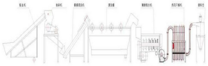 由輸送機(jī)將原料送至破碎,預(yù)碎機(jī)已速比1:35的超低轉(zhuǎn)速,用雙刀盤(pán)將塑料撕裂,切碎至3-10CM片狀,然后將片狀原料送至,二次粉碎機(jī),通過(guò)合金刀盤(pán)的高速轉(zhuǎn)動(dòng)將其破碎,粉碎機(jī)底部有出料篩網(wǎng),可根據(jù)需要控制出料尺寸,出料后,由水力清洗機(jī)對(duì)塑料進(jìn)行清理,再由脫水機(jī)進(jìn)行脫水作業(yè),脫水后的塑料顆?梢灾苯铀椭,氣流烘干送至料倉(cāng),作為再生塑料備料儲(chǔ)存。