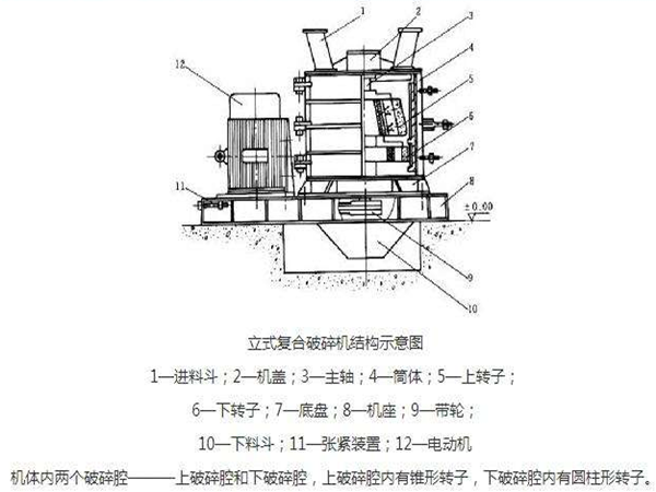 立軸復(fù)合式破碎機組成:立軸復(fù)合式破碎機主要由進料斗,機蓋,主軸,簡體,上轉(zhuǎn)子,下轉(zhuǎn)子,底座,機座,帶輪,下料斗,張緊裝置,電動機等部件組成。